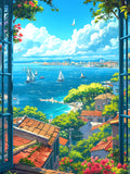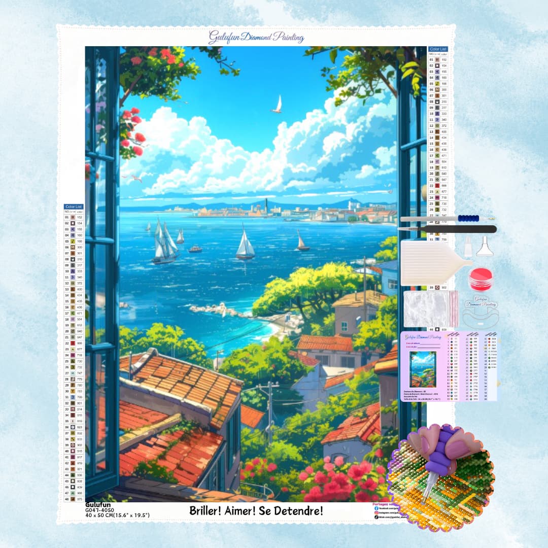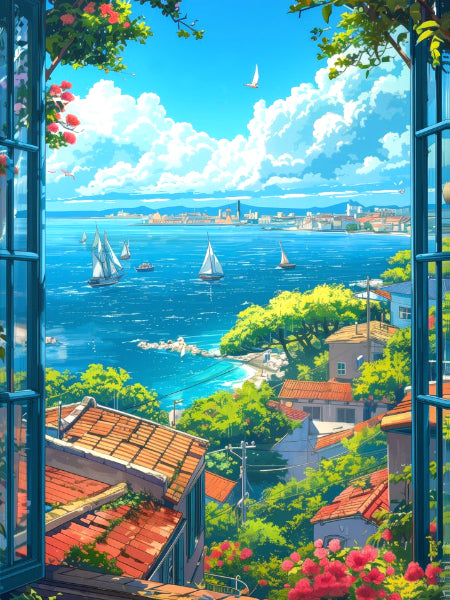 Ouvrez la fenêtre, et la mer azur et le ciel clair se fondent dans un poème. Les voiles blanches sont comme des notes vives dansant sur les vagues bleues. Les maisons aux tuiles rouges sur le rivage sont cachées parmi la verdure luxuriante et les belles fleurs, et la ville au loin se profile dans la brume.