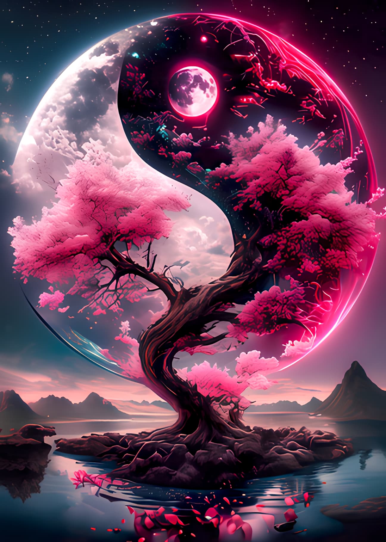 🤯La moitié est constituée de pur clair de lune et de nuages blancs,et la moitié est la coquette nuit cramoisie au clair de lune, qui,ensemble,créent un magnifique cerisier Yin-Yang🌸.