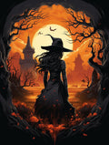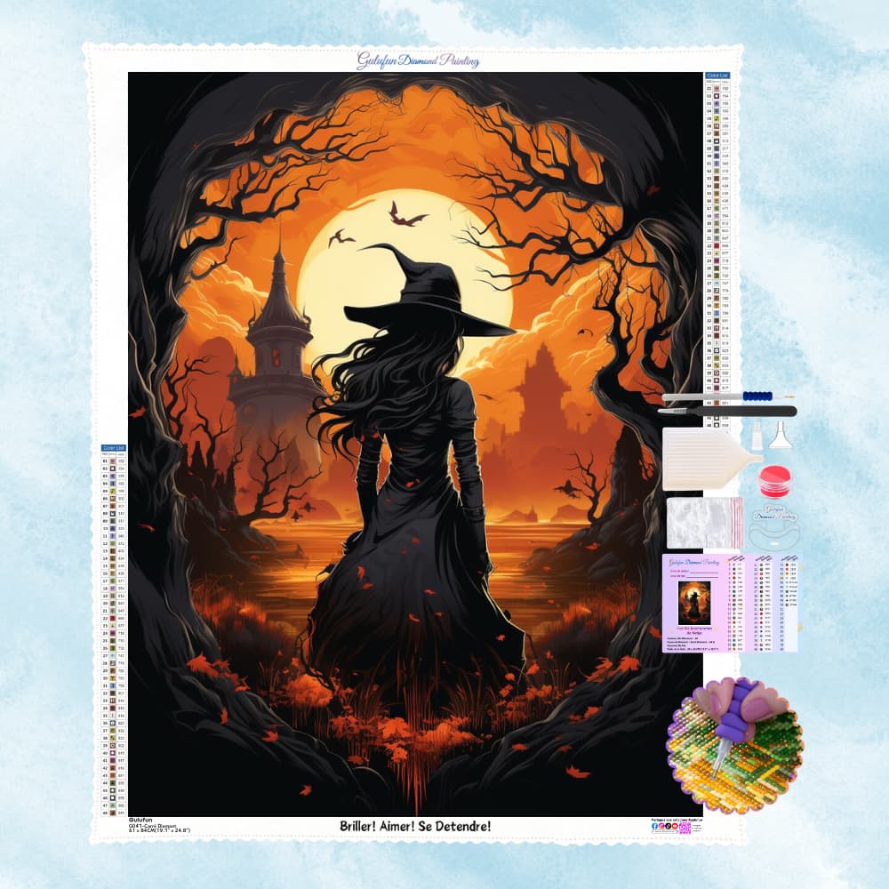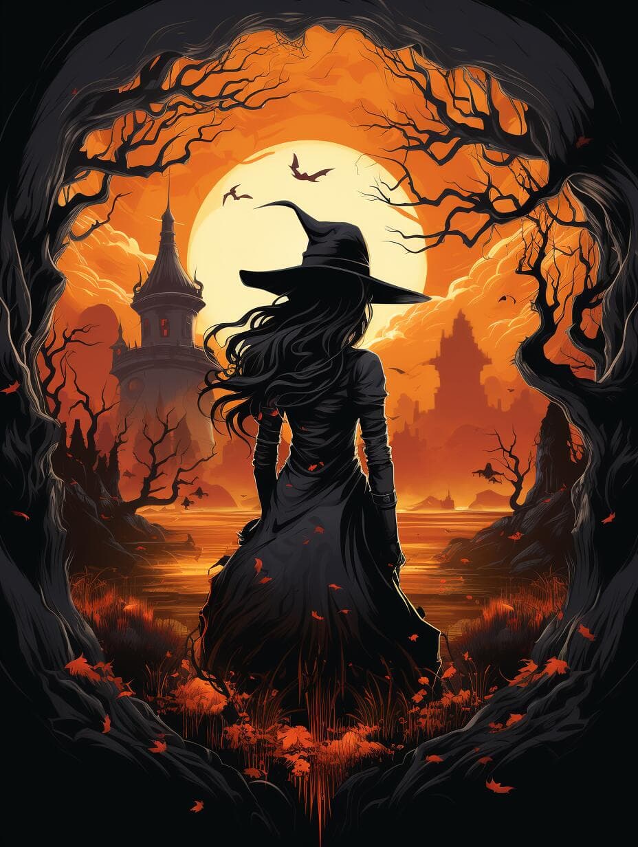 Dos d’une sorcière au chapeau pointu, face à une lune orangée, arbres morts et château hanté. Ambiance nocturne halloween.