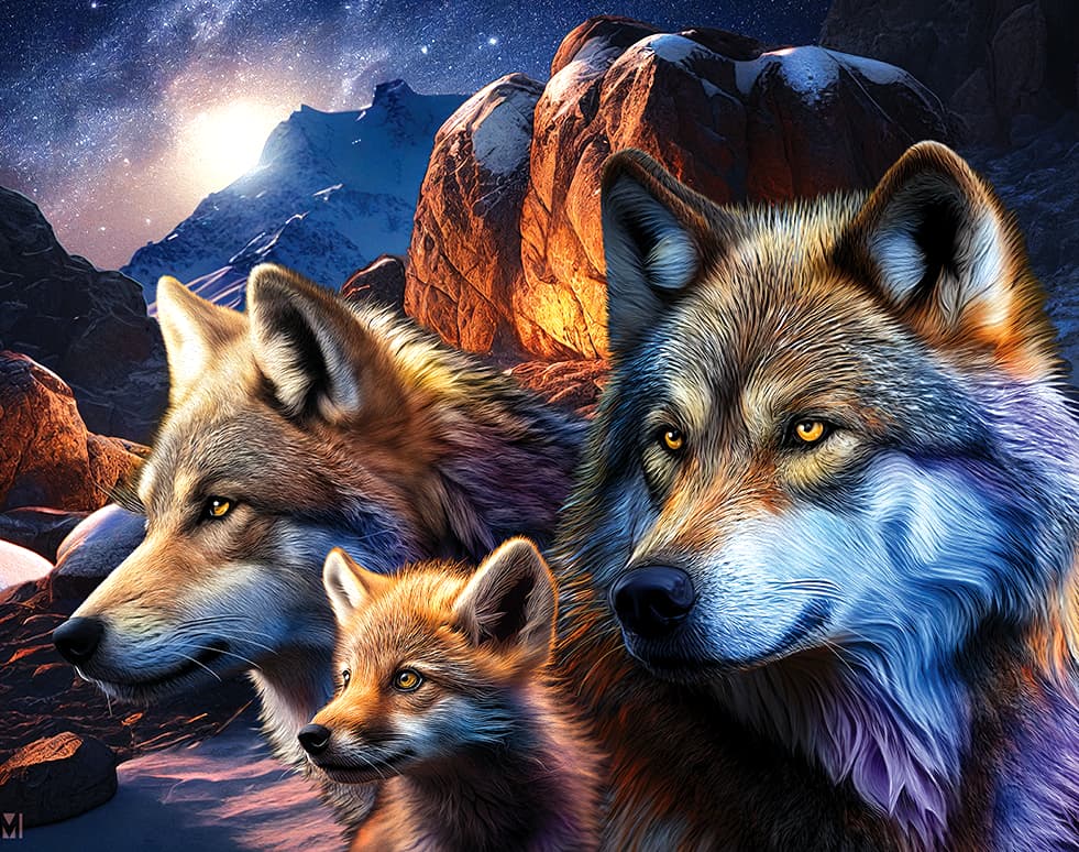 Succombez au charme mystique de cette tribu de loups, dont la fourrure irradie d'éclats irréels de bleu, de violet et d'orange, se découpant devant un fond spectaculaire mêlant montagnes enneigées, ciel étoilé et roches aux tons chaleureux.