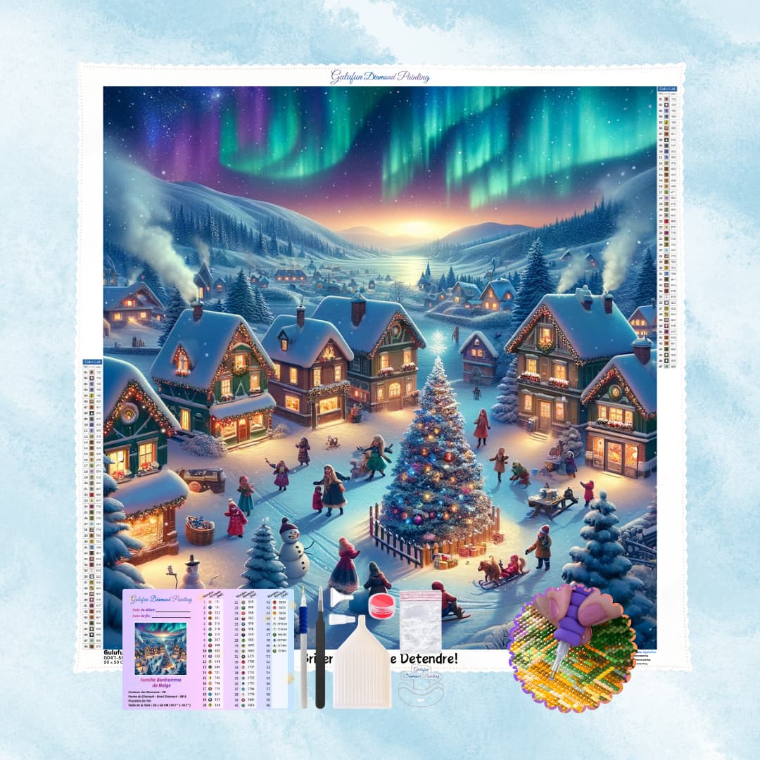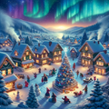 Par une nuit enneigée,le village se transforme en un royaume de conte de fées,les aurores boréales flottent comme des rubans magiques et le sapin de Noël brille de mille feux.