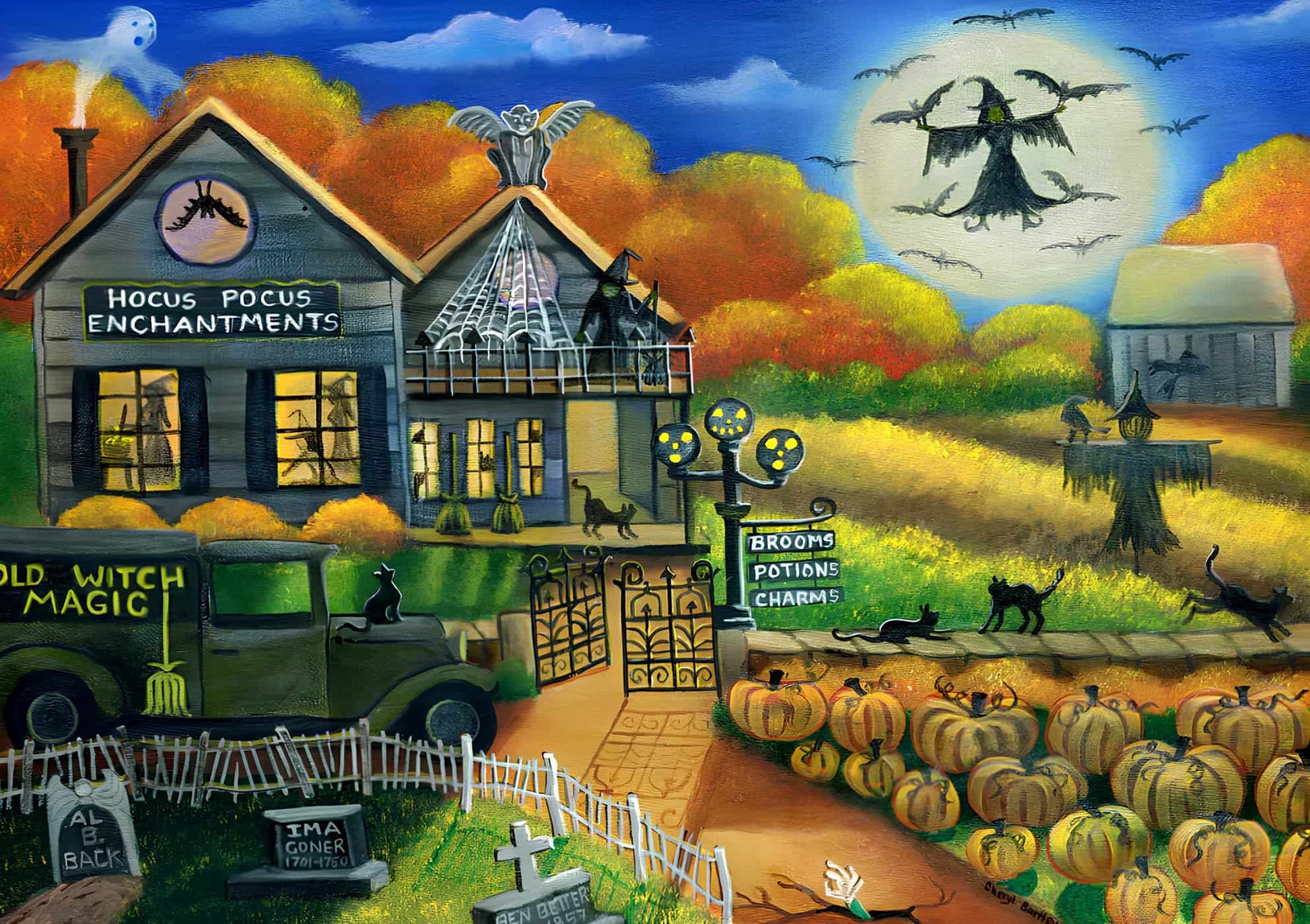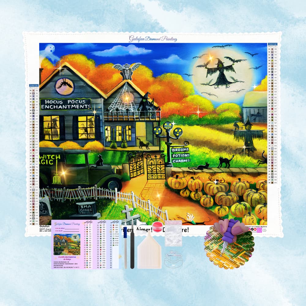 Village avec boutique de sortilèges, citrouilles, chats noirs, sorcières et fantôme, sous une lune avec sorcière de chauves-souris.